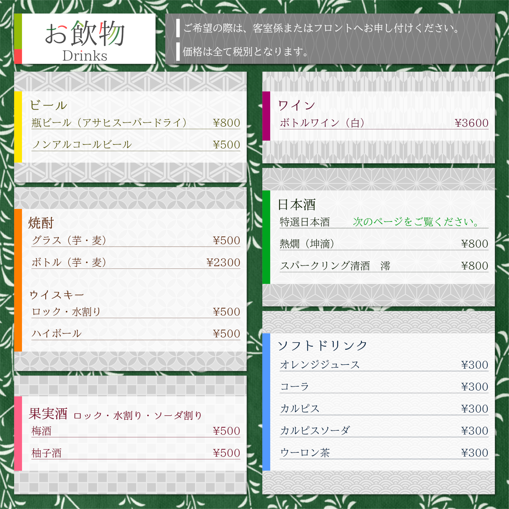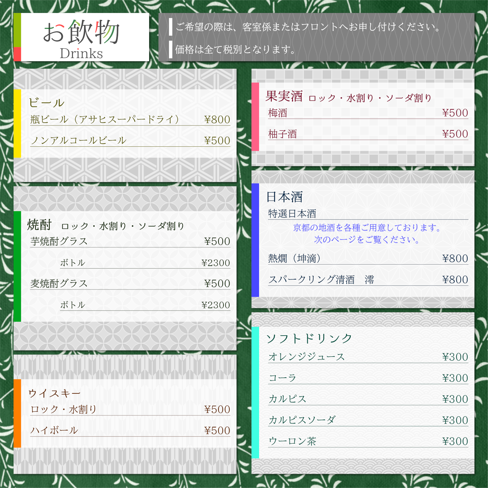 京都の地酒をはじめ、ビール・焼酎等、各種お飲物をご用意いたしております。